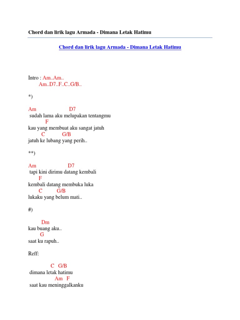 Berikut cuplikan syair nyanyian teks dari lagunya. Cuma begini saja Kisah yang kita punya Sampai segini saja Ku di depan matamu. Chord Gitar dan Lirik Lagu Dimana Hatimu - Papinka.